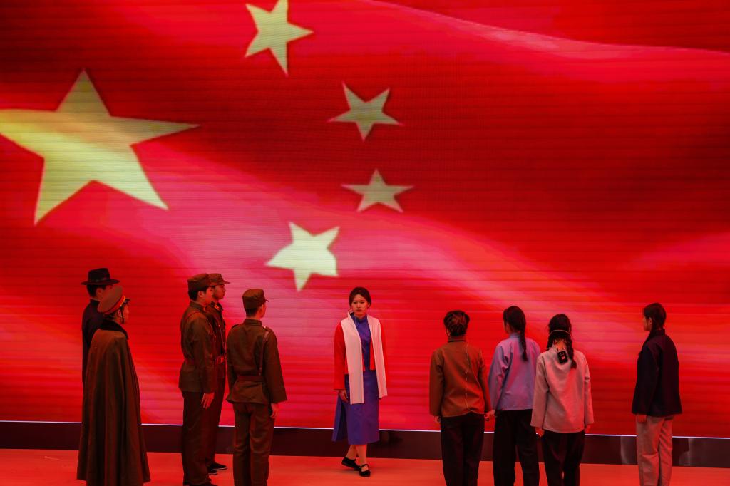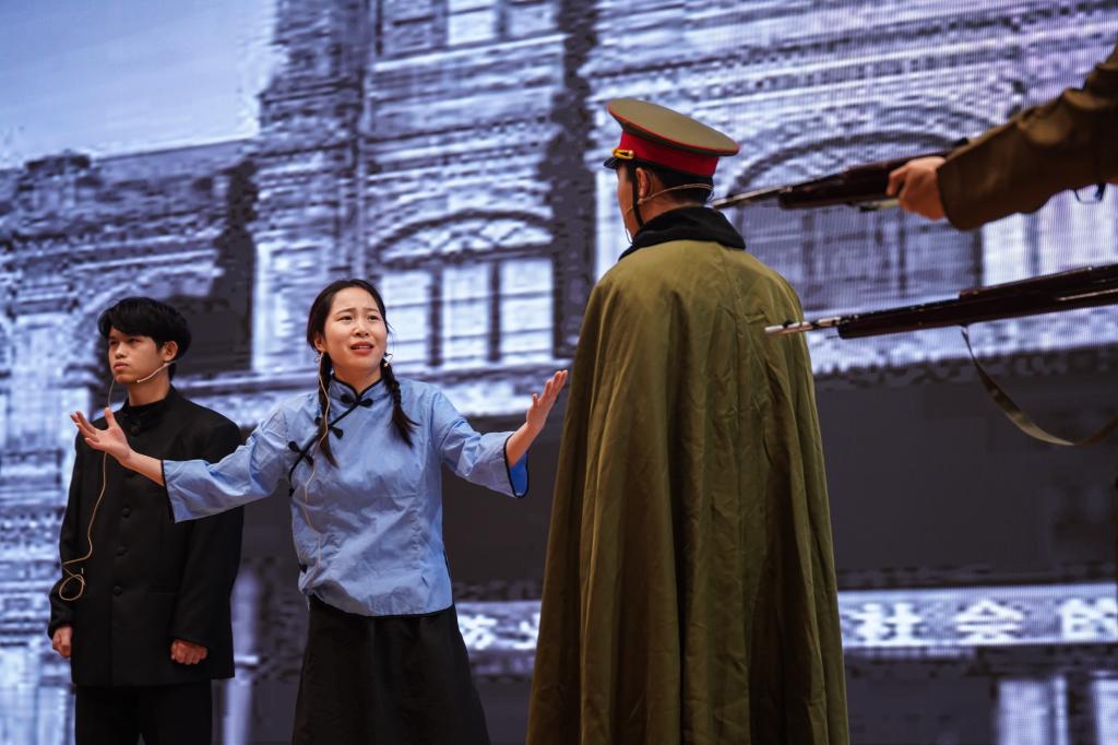 话剧《江姐》以江姐入狱为主线,讲述了那个年代中坚贞不屈的共产党员英勇抗争的故事。由于被叛徒甫志高出卖,江姐在川北被敌人逮捕,并被关进了重庆中美合作所渣滓洞集中营。面对敌人的严刑拷打和威逼利诱,江姐大义凛然、坚贞不屈,严词痛斥敌人。话剧演员们现场吟唱歌曲《绣红旗》将现场气氛烘托至高潮!耀眼的红,金辉的黄,一针一线,串联成对祖国深沉的热爱。江姐转身离去又回眸的那一幕,观众无不热泪盈眶,真切地感受到革命先辈们为了新中国的成立浴血奋战的峥嵘岁月。