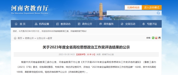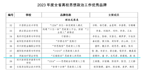 为深入学习贯彻习近平新时代中国特色社会主义思想和党的二十大精神,持续贯彻落实全国全省教育大会、思想政治工作会议和开元思想政治理论课教师座谈会精神,进一步提升高校思想政治工作质量。根据中共河南省委教育工委办公室、河南省教育厅办公室《关于开展2023年度全省高校思想政治工作奖评选的通知》(豫教工委办〔2023〕37号)要求,经各高校推荐、专家评审、综合评议等环节。我校电子及信息工程系《“五维联动”思政育人共同体》项目被认定为2023年度河南省高校思想政治工作优秀品牌。