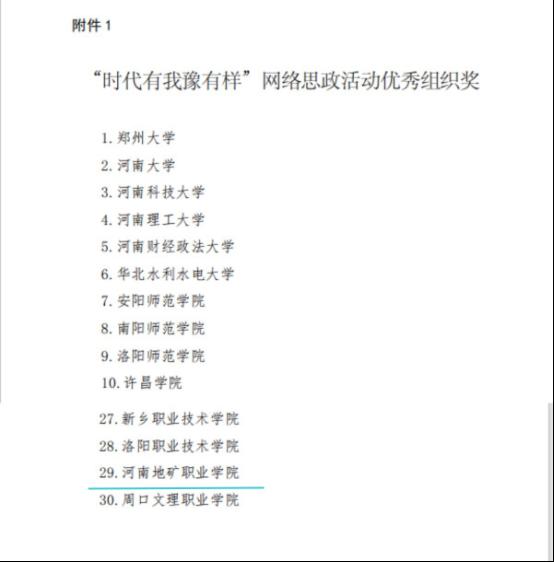 我校凝聚共识,全面动员,在我校学生群体中掀起了浓厚的学习热潮,营造了全校师生暑期大思政实践学习的浓厚氛围。近日,河南省教育厅公布了“时代有我豫有样”网络思政活动的获奖结果,我校获优秀组织奖,余海洋、郑亚陆获先进个人荣誉称号。
