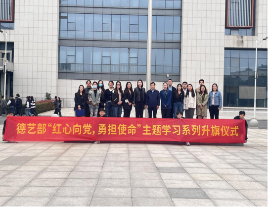 2023年10月7日清晨,德艺部举行“红心向党,勇担使命”主题升旗仪式。校党委书记焦洪涛、德艺部党支部书记陈蓉、后勤处主任张卫民、德艺部团总支书记谢宁、德艺部全体党员老师及行政值班老师参加升旗仪式,仪式由教师张梦主持。