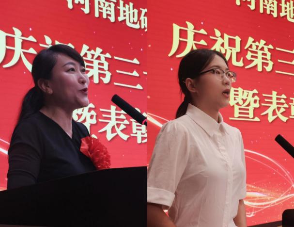 地勘系教师王雪芹、经管系学生张清滢代表师生进行发言。党委副书记、工会主席杨健、副校长张霖、冯敏、张红兵分别宣读获奖先进集体及先进个人决定。
