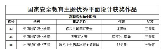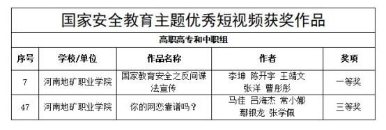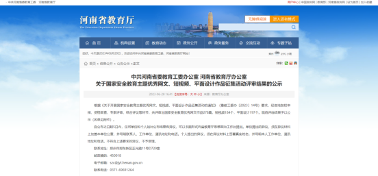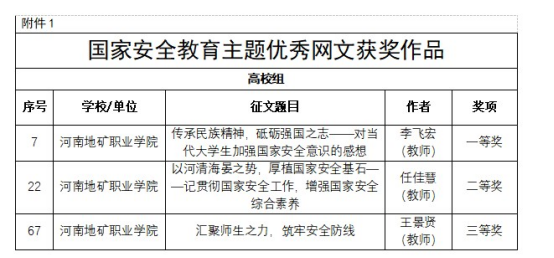 近日,河南省教育厅举办的国家安全教育主题优秀网文、短视频、平面设计作品征集活动公布了评审结果。我校师生参赛作品荣获一等奖2项,二等奖1项,三等奖5项。具体名单如下: