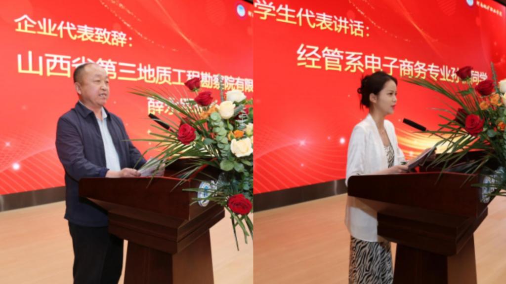 我校优秀毕业生山西省第三地质工程勘察院有限公司薛永军院长作为企业代表进行发言。他非常感谢开元能够组织此次校园双选会,为用人单位和毕业生搭建互相了解,当面交流沟通的平台,进一步实现企业与人才的双向奔赴。同时,自己作为一名校友,深情表达了自己饮水思源情系母校的情怀。按照会议流程,经济管理系毕业生孙楠代表学生发言。