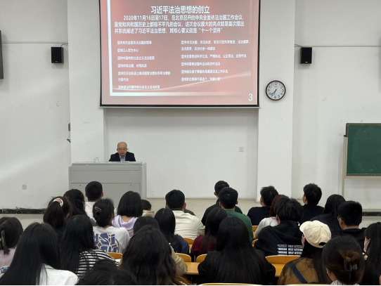 他向大家讲述了“依法治国”的概念和“全面依法治国”的提出过程和确立时间,重点讲解了习近平法治思想的创立和形成。他讲到,习近平法治思想是一个内涵丰富、论述深刻、逻辑严密、博大精深的重大理论成果,是全面依法治国的根本遵循和行动指南,在全面依法治国进程中具有里程碑意义。习近平法治思想是习近平新时代中国特色社会主义思想的重要组成部分,他从为什么要全面推进依法治国、如何理解全面依法治国的总目标、如何建设法治中国等三个方面讲解了全面依法治国。