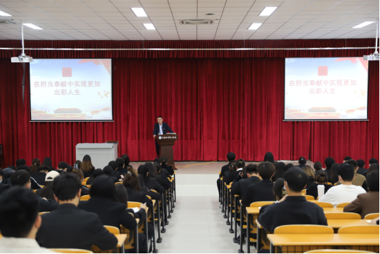 冯敏以《新时代青年更应担当奉献》为题,围绕习近平总书记对青年的殷切希望、伟大时代是青年成长的沃土、在担当奉献中实现更加出彩人生等内容展开。他对地矿职院的青年学生提出四点要求:一是做有理想的青年。牢记“请党放心 强国有我”的铮铮誓言,坚定不移听党话、跟党走,努力成长为堪当民族复兴重任的时代新人。二是做敢担当的青年。勤奋学习,练就过硬本领,锤炼品格修为,在生动的社会实践彰显青年担当。三是做能吃苦的好青年。响应时代召唤,继承和发扬吃苦耐劳、自力更生的精神,接受风雨的洗礼,铸就“自找苦吃”的精神品格。四是做肯奋斗的青年。用青春的活力和创造力在人生的赛道上奋力奔跑,努力学习专业技能本领,争做能工巧匠,大国工匠,为实现中华民族伟大复兴做出应有的贡献。