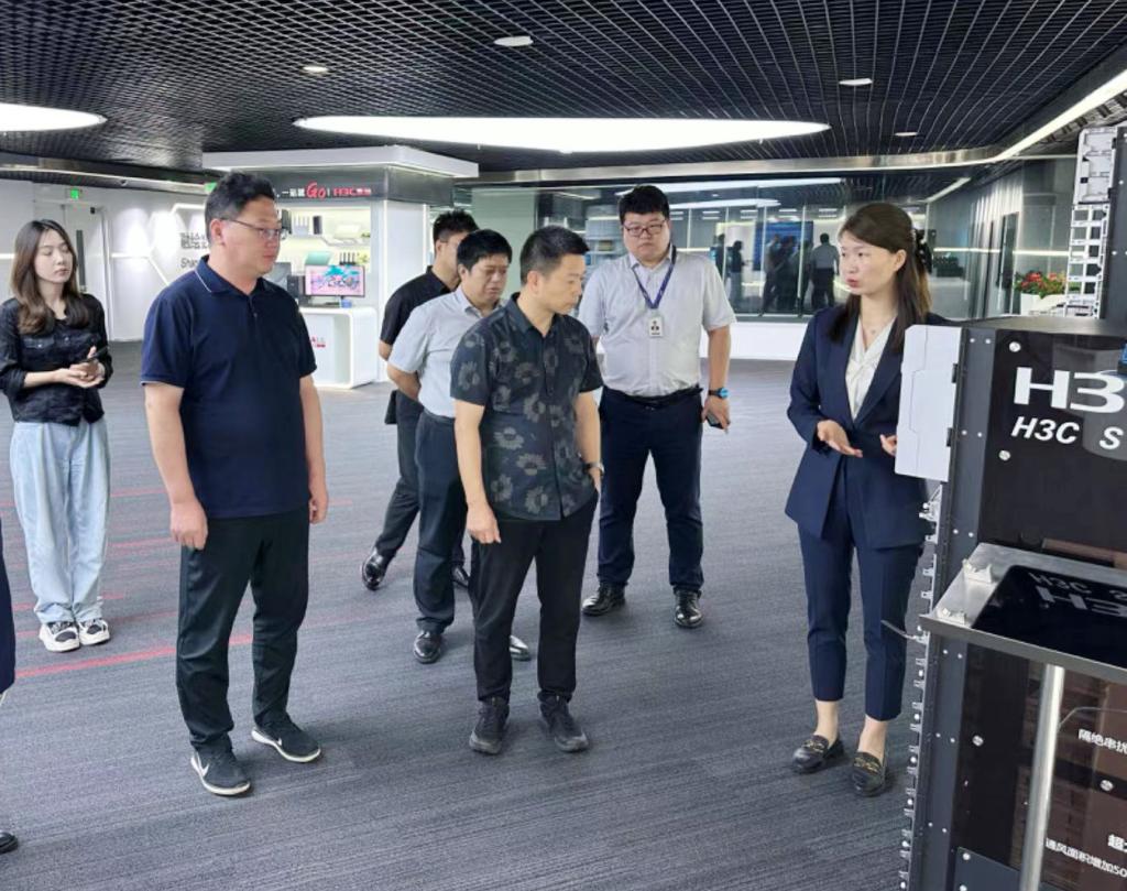 考察团首先参观了新华三集团望京总部的公司产品宣传展厅,新华三集团作为新紫光集团旗下的核心企业,作为数字化解决方案领导者,目前研发人员占比超过50%,专利申请总量超过14,000件,其中90%以上为发明专利,拥有计算、存储、网络、5G、安全、终端等全方位的数字化基础设施整体能力,提供云计算、大数据、人工智能、信息安全、智能联接等在内的一站式数字化解决方案。