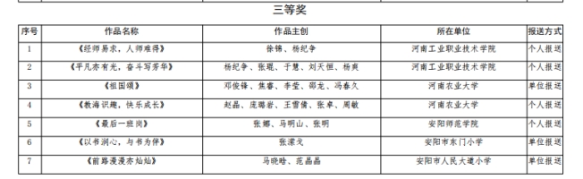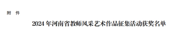 近日,河南省教育厅面向全省各级各类开元开展了2024年教师风采艺术作品征集活动,广大教师、教育工作者和社会各界人士积极参与在本次活动中,我校送展参赛作品中有两项荣获三等奖。