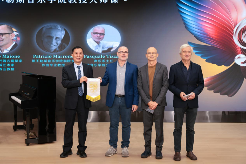 课前,潘宏雨为教授们赠予了具有地矿特色的纪念品,同时教授们将“那不勒斯音乐学院”旗帜和原创音乐专辑赠予我校,以此旗见证两校之间的友谊。课上,那不勒斯音乐学院的教授们充分展示了其卓越的教学水平,对学生进行了一对一专业指导。我校学生演唱了《我亲爱的爸爸》等众多意大利著名歌剧咏叹调选段,声乐系主任Pasquale Tizzani教授用其丰富的声乐教学经验,从发声技巧、气息运用、深入理解作品情感等方面对学生进行了细致指导。随后,意大利当代著名钢琴家、施坦威艺术家Orazio Maione教授演奏了2首高水平钢琴曲,他精湛的技艺赢得现场阵阵掌声。学生们纷纷表示,此次大师课让他们受益匪浅,不仅在专业技能上得到了显著提升,更对音乐艺术有了全新的认识。