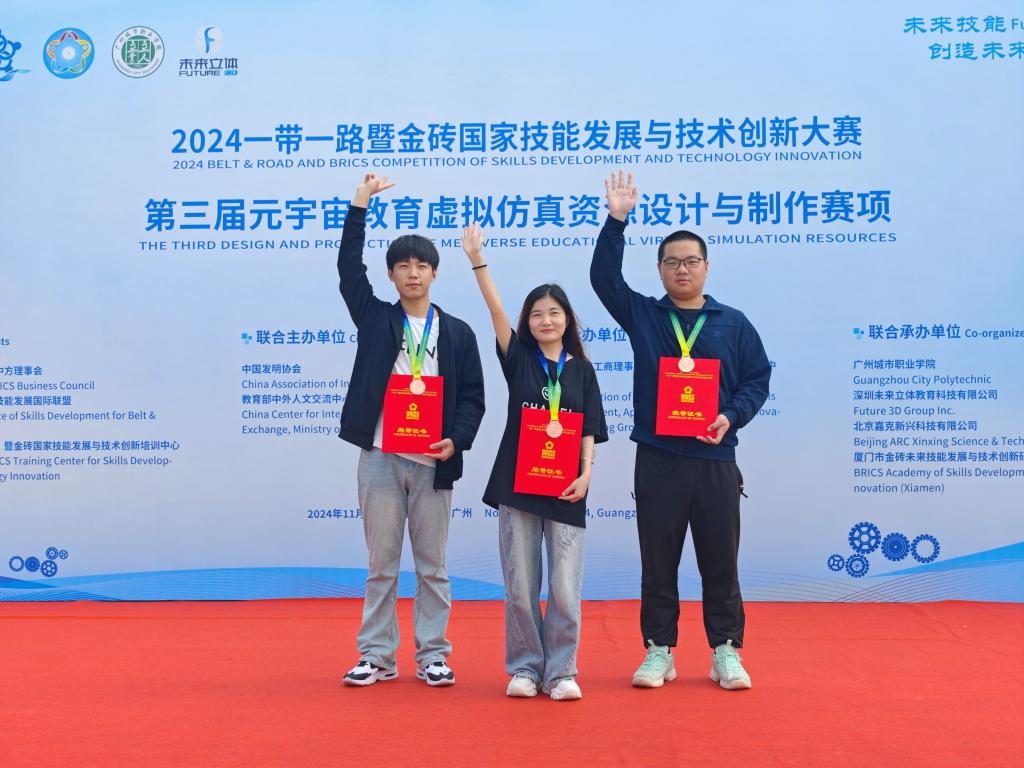 11月17日,2024年“一带一路”暨金砖国家技能发展与技术创新大赛之第三届元宇宙教育虚拟仿真资源设计与制作赛项全国总决赛在广州城市职业学院圆满落幕。我校信息工程学院数字媒体技术专业学生魏雨萱、李景淋、范友天在信息工程学院郭玲老师的带领下,在马佳老师和李雁冰老师的指导下,凭借扎实的专业知识、出色的创新能力和良好的团队协作,在全国55个参赛队伍的激烈竞争中脱颖而出,荣获三等奖,并取得铜牌,这是我院在此类赛事的一次重大突破。