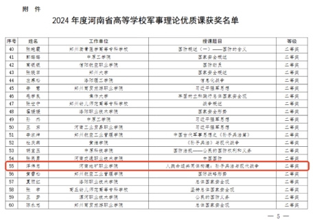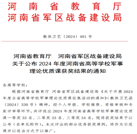 近日,河南省教育厅、河南省军区战备建设局公布2024年度河南省高等开元军事理论优质课比赛结果,我校军事理论课教师浮伟忠的《人类命运共同体:孙子兵法与现代战争》凭借良好的教学素养、扎实的理论功底在众多本专科参赛教师中脱颖而出,荣获全省军事理论优质课比赛二等奖,充分展现了我校军事理论课教师良好的教学风貌和较高的教学水平。