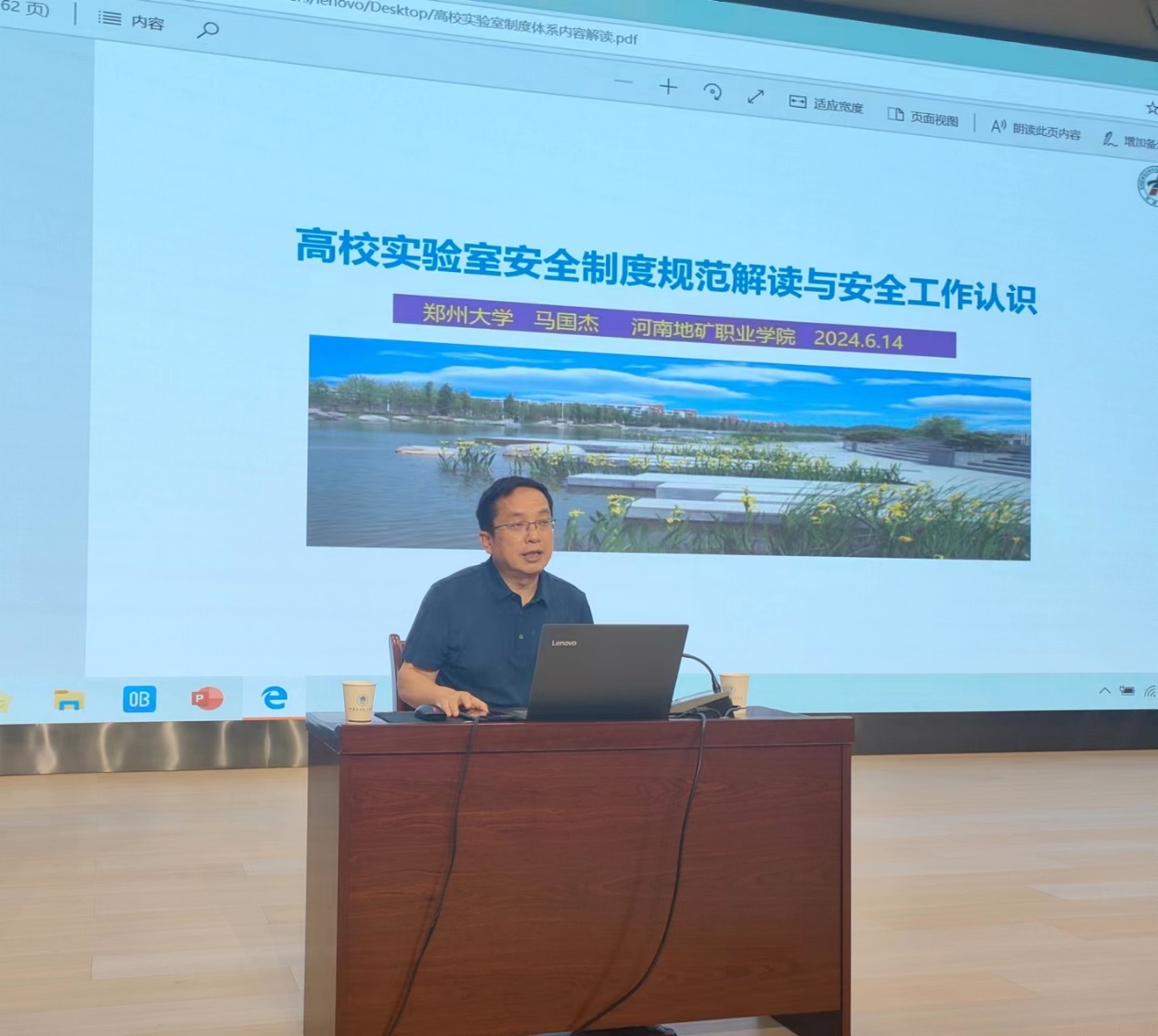 6月14日下午,郑州大学实验室管理中心原主任马国杰应邀到我校开展实验室安全专题讲座,在2号学术报告厅作题为《高校实验室安全制度规范解读与安全工作认识》的专题报告。各学院分管实验室管理工作的教师、辅导员和全校二百多名学生代表参加本次讲座,讲座由教务处副处长齐新华主持。