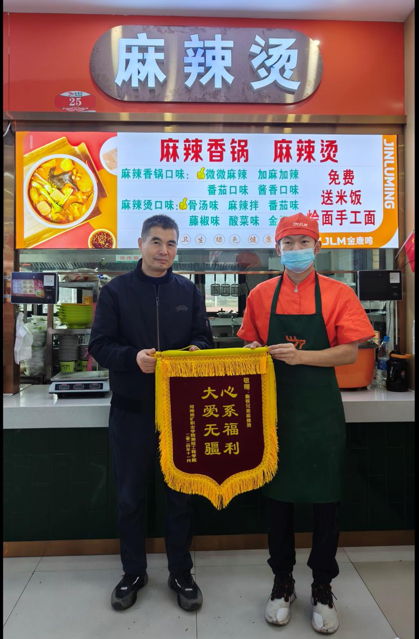 1.学生餐厅1楼“趣筷兄弟麻辣烫”窗口为福利院捐赠20箱饮料,测绘工程学院院长卢西魁为窗口赠送锦旗并表达感谢。