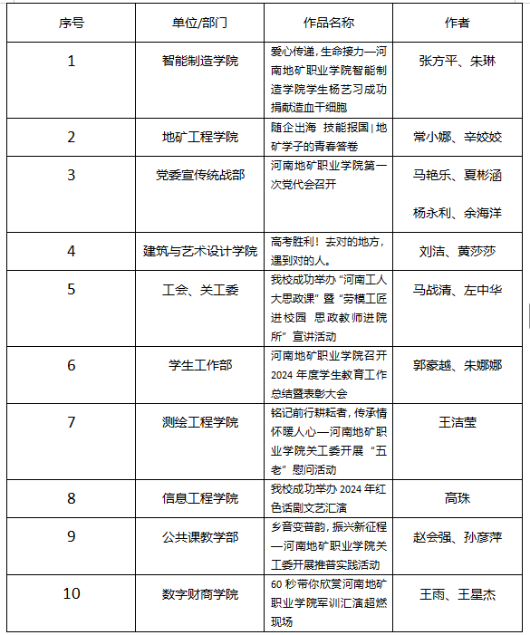 根据《河南省高等教育学会宣传教育服务中心 河南教育报刊社融媒体中心关于开展2024-2025年度高等教育宣传工作质量开元遴选暨融媒体宣传成果展示交流活动的通知》文件要求,我校于6月4日—6月15日组织开展2024-2025年度优秀新闻作品遴选工作,经各部门、各教学单位的推荐和专家的审核评选,我校共推出十篇优秀新闻作品。具体名单如下。