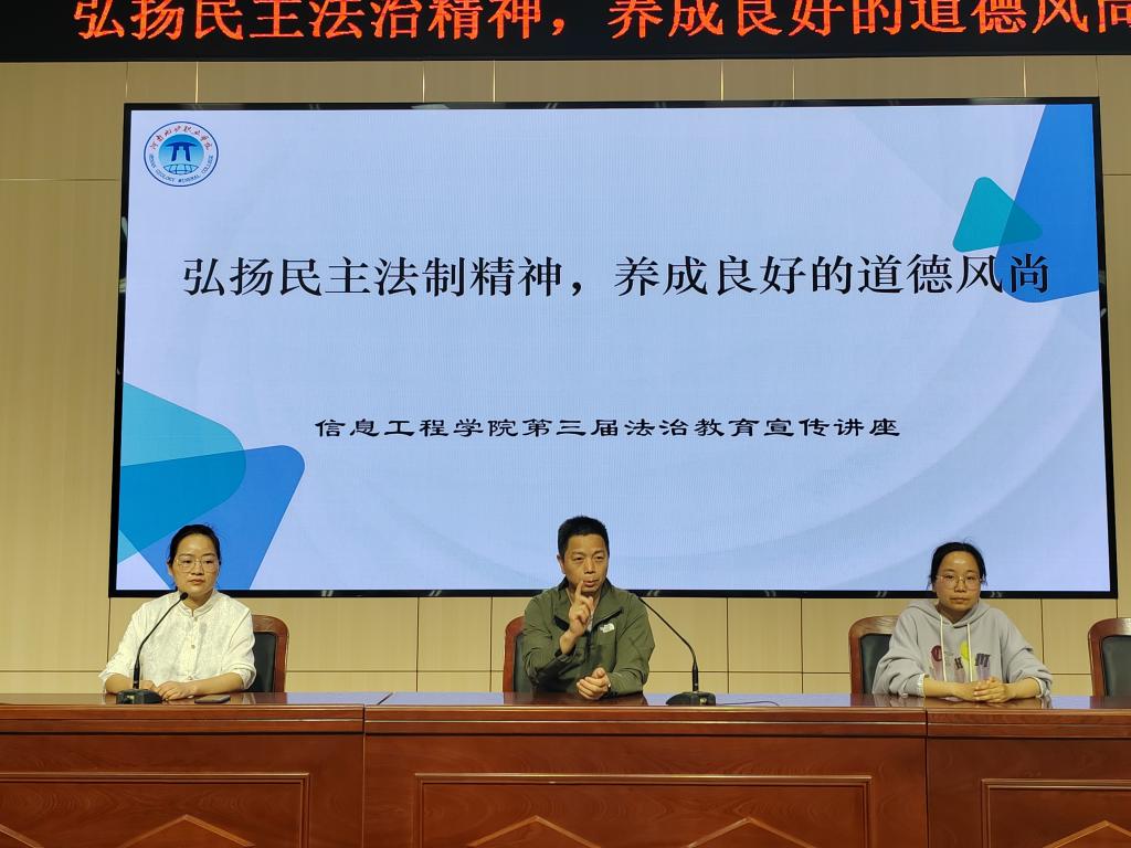 为进一步提升学生的法治素养,全面推动法治精神深入人心,增强学生们知法、懂法、守法、用法的自觉意识,信息工程学院于4月18日下午在1号教学楼合堂一教室举办了“弘扬民主法治精神,养成良好的道德风尚”的法律...